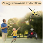Nadajnik pilota pozwala na sterowanie samolotem z odległości do 100 m . To odpowiednia odległość aby robić duże manewry, jednak bez ryzyka utraty pilota z zasięgu wzroku.